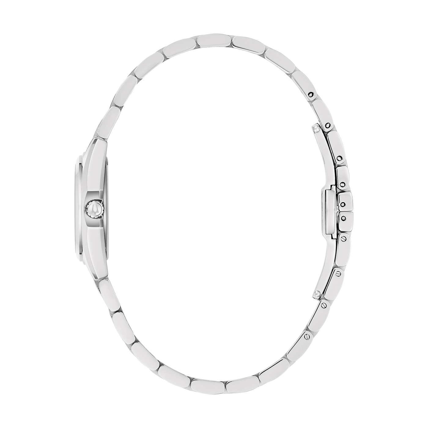 De Bulova 96L346 heeft een roestvrijstalen kast van 31 millimeter breed en 8,05 millimeter dik, voorzien van krasbestendig saffierglas. De lichtblauwe wijzerplaat wordt geaccentueerd door fijne indexen en lichtgevende wijzers. De zilverkleurige roestvrijstalen band met inklapbare gesp zorgt voor duurzaamheid en draagcomfort.
