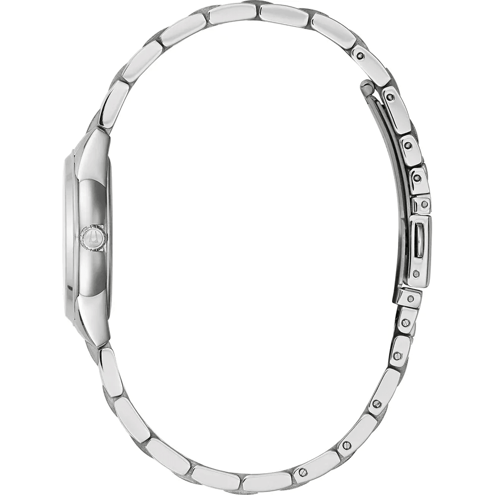 The Bulova 96P249 from the Lady Sutton Spring/Summer 2024 collection is a refined and elegant timepiece for the stylish woman. This model combines a soft pink dial with a sleek silver-tone stainless steel case, giving it a timeless and chic look. With a case diameter of 28 mm and a thickness of 8 mm, the watch is compact and lightweight, ideal for everyday use without compromising on style. The silver hands add subtle refinement, while the sapphire crystal provides extra protection against scratches and everyday wear.