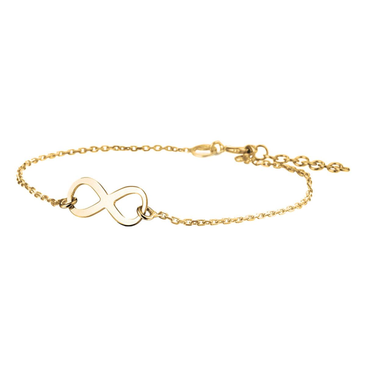 This elegant silver plated bracelet is a beautiful symbol of infinity and timeless style. Featuring an infinity symbol and a high-quality 3-micron yellow gold plating, this bracelet offers a refined look. The bracelet has a wearing length of 17 cm and a 2.5 cm extension, perfectly adjustable for any wrist. With a link width of 1.4 mm and a sturdy anchor design, this bracelet is a subtle yet stylish addition to your jewelry collection. Please note: there is no guarantee on the plating.