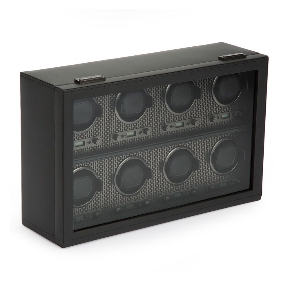The WOLF Axis Octave Watch Winder 469703 is the pinnacle of engineering and design for the serious watch collector. With its rugged, powder-coated steel casing, microsuede interior and matte chrome accents, this winder exudes power and luxury. The eight winding modules use WOLF's patented technology that counts the exact number of rotations (300–1200 TPD), with three directions of rotation for maximum compatibility. Thanks to the lockable glass cover, illuminated LCD display and mains power supply, this is an extremely functional and stylish solution for your precious collection. Free shipping at Juwelier van Dam.