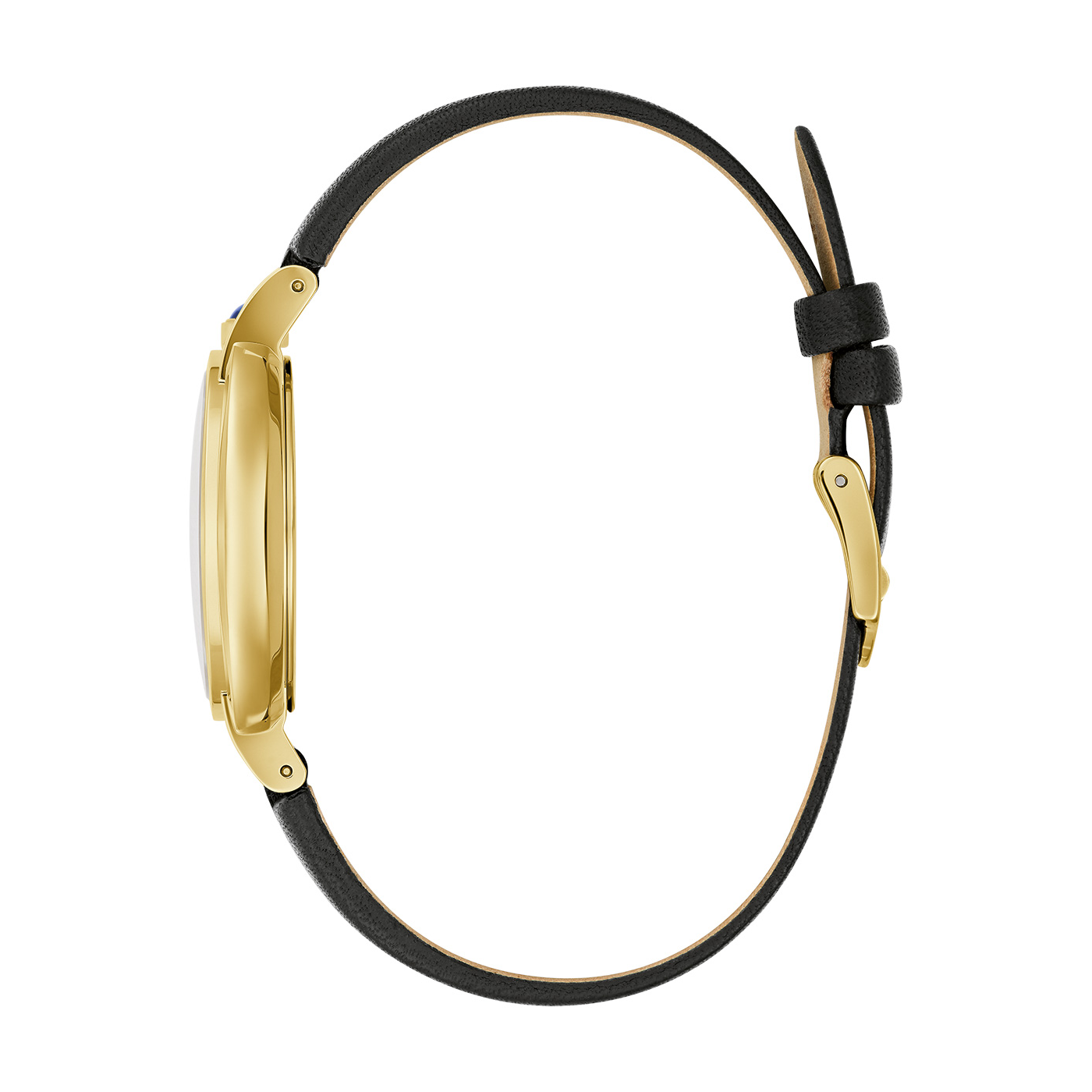 De Bulova 97P180 Ella Fitzgerald Special Edition is een bijzonder dameshorloge dat elegantie en exclusiviteit uitstraalt. Met een diameter van 28,8 mm en een kasthoogte van 8,6 mm heeft dit horloge een verfijnd formaat dat perfect aansluit bij een elegante damespols. De goudkleurige roestvrijstalen kast is subtiel verfraaid met één echte diamant, wat dit model een luxueuze uitstraling geeft.