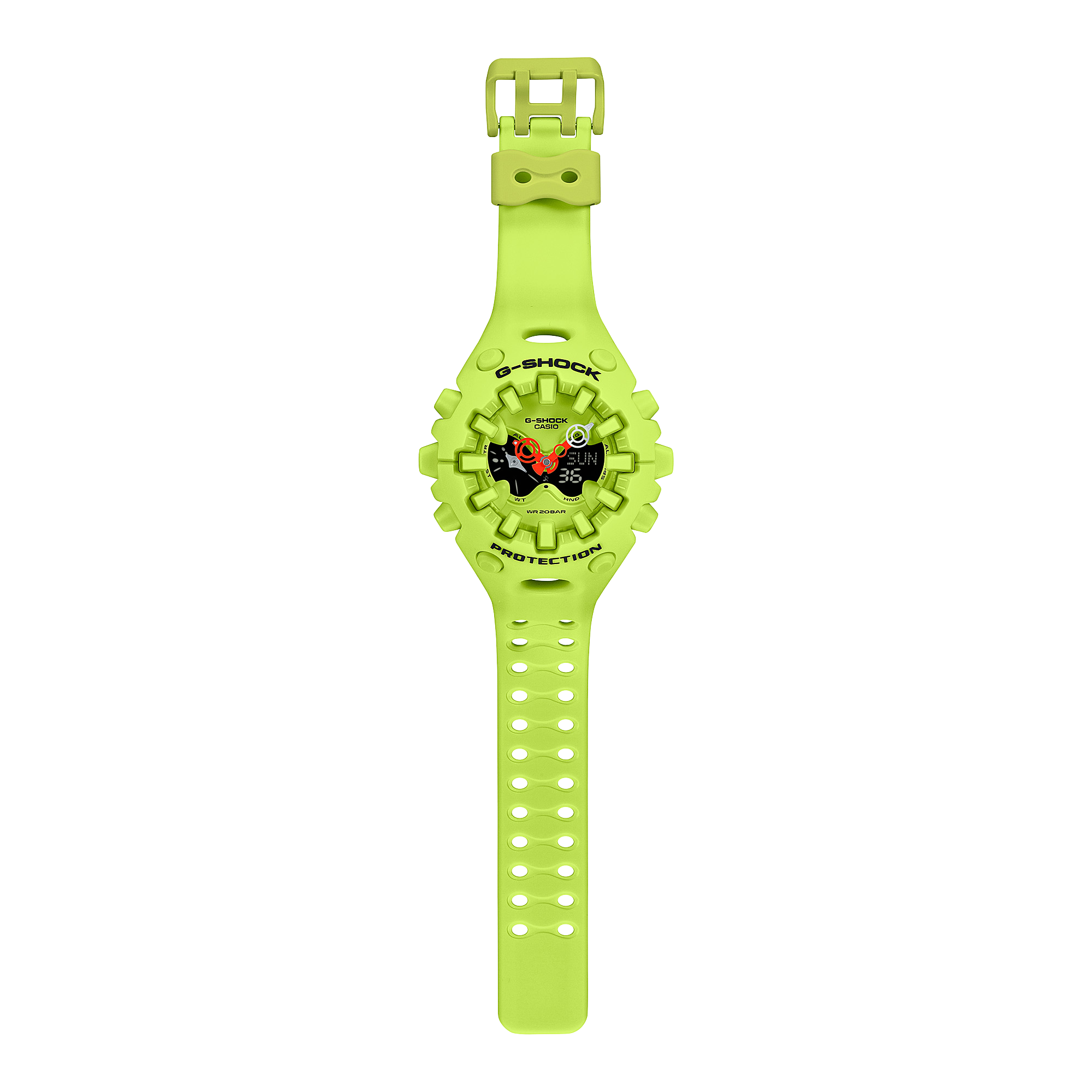 De G-Shock GA-V01-9AER is een statement piece pur sang. De geïntegreerde kast-bandconstructie werkt als een bumper, het mineraalglas ligt beschermd en de magnetische ‘shock release’ wijzers keren na een harde tik vanzelf terug op positie. Samen met 20 bar waterdichtheid en een 10-jaars batterij is dit de felgele G-Shock die gemaakt is om op te vallen én het altijd te blijven doen.
