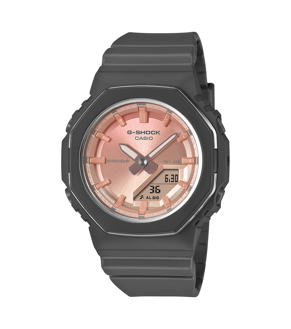 De GMA-P2110SC-4AER vertaalt de zachtheid en symboliek van rozenkwarts — schoonheid en gezondheid — naar een moderne G-Shock voor kleinere polsen. De subtiele roze kleurverloop-wijzerplaat heeft een luxe metallic finish en wordt omlijst door een strak vormgegeven octagon bezel met glanzende ring.