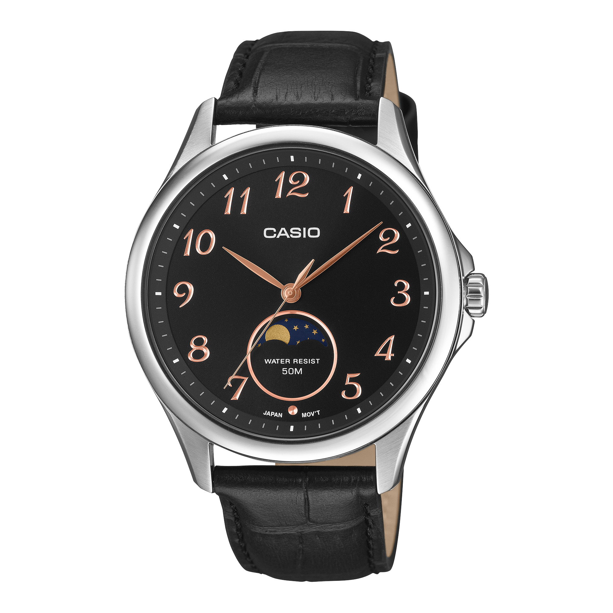 De Casio MTP-M110L-1AVER combineert tijdloos design met een geliefde klassieke complicatie: de maanfase-indicator op 6 uur. Het slanke profiel van slechts 9,6 mm en de comfortabele lederen band maken dit horloge ideaal voor formele én casual outfits. De stijlvolle zwart-gouden wijzerplaat voegt luxe toe, terwijl mineraalglas, RVS kast en 5-bar waterbestendigheid dagelijks draaggemak garanderen.