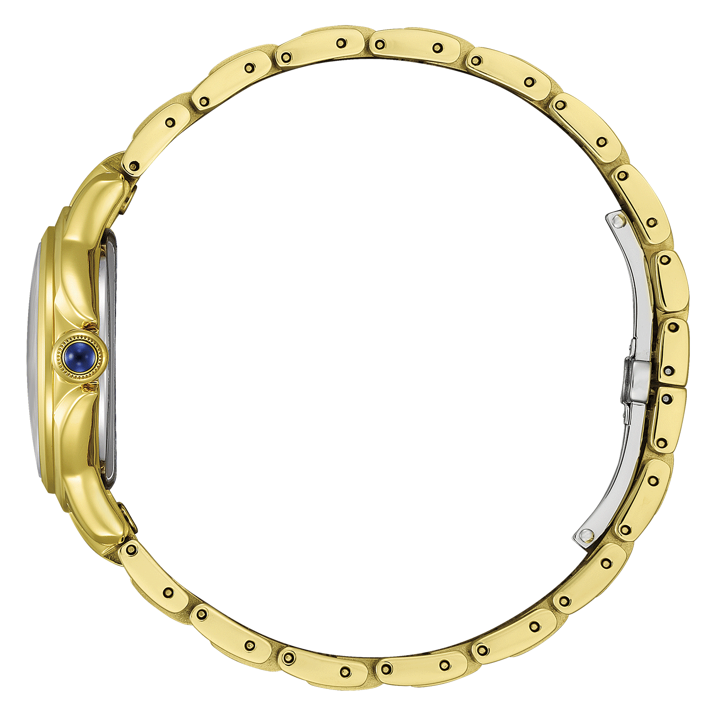 De Citizen Elegance EM1162-52A is een stijlvol dameshorloge dat verfijning combineert met de betrouwbare Eco-Drive technologie van Citizen. Het horloge heeft een compacte ronde kast met een diameter van 30,25 mm, een hoogte van 8,7 mm en een gewicht van 73 gram. De kast is uitgevoerd in verguld roestvrij staal, wat zorgt voor een elegante uitstraling in combinatie met de zilverkleurige roestvrijstalen band met dubbele duwgesp.