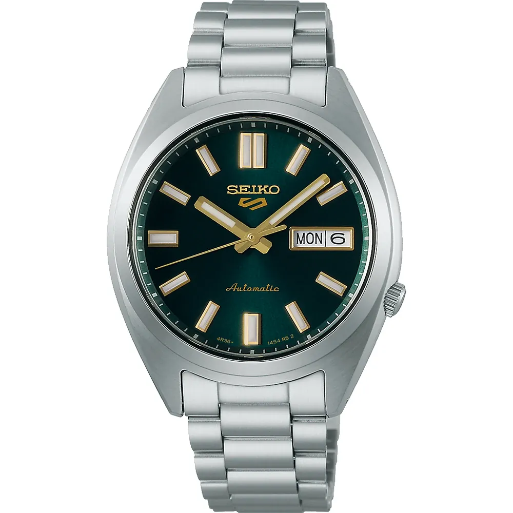 De Seiko 5 Sports SRPL57K1 ‘Green Tie’ is de groene tegenhanger in de SNXS-heruitgave: compact 37,4 mm, verfijnd en met een duidelijke knipoog naar Seiko’s iconische seventies-cases. De diepgroene sunburst-wijzerplaat krijgt extra klasse door goudkleurige wijzers en indexen, terwijl de roestvrijstalen kast en schakelband zorgen voor dagelijks draagcomfort. Hardlex glas biedt degelijke krasvastheid en Lumibrite garandeert goede afleesbaarheid in het donker. Met dag-/datum is dit een stijlvolle allrounder die moeiteloos van kantoor naar weekend gaat.