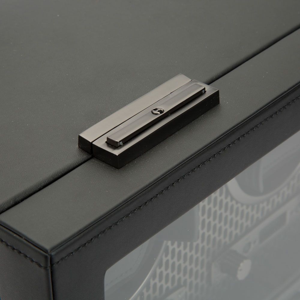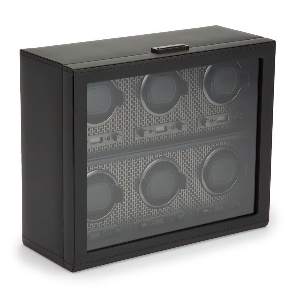 The WOLF Axis Six-Wind Watch Winder 469603 is the epitome of powerful luxury and technical perfection. With a black powder coating, perforated steel and a soft microsuede interior, this winder exudes modern class. The six winding modules use WOLF's patented technology that counts the exact number of revolutions (300–1200 TPD), with adjustable rotation directions for each watch type. The lockable glass cover, illuminated LCD display and high-quality finish make this model ideal for the serious collector. Works on mains power (adapter included). Free shipping at Juwelier van Dam.